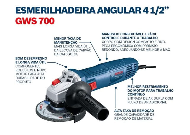 A Esmerilhadeira Bosch GWS 700 possui 710W de potência e é uma ferramenta leve, robusta e eficiente, ideal para cortes e desbastes em diferentes aplicações. Seu motor com escovas de carvão oferece maior vida útil e baixo custo de manutenção. O design otimizado aliado à pega ergonômica proporciona conforto e segurança durante o uso.