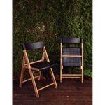 Produzida em madeira Itaúba com acabamento natural lixado, possui assento e encosto em polipropileno preto e um design contemporâneo, elegante e diferenciado. O modelo dobrável garante praticidade e economia de espaço no transporte e armazenamento.