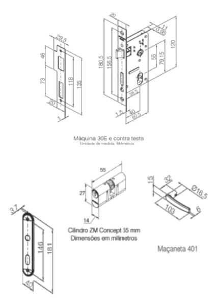 - Conta com maçaneta em zamac espelho testa e contra testa em aço inoxidável.