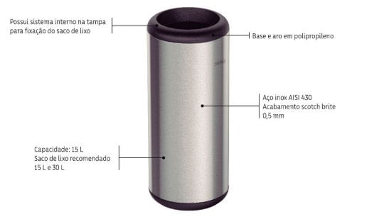 Perfeita para qualquer ambiente, ela conta com a qualidade dos produtos fabricados no Brasil. Possui capacidade de 15 litros e aramado interno para fixação do saco de lixo, garantindo mais praticidade no uso diário.
